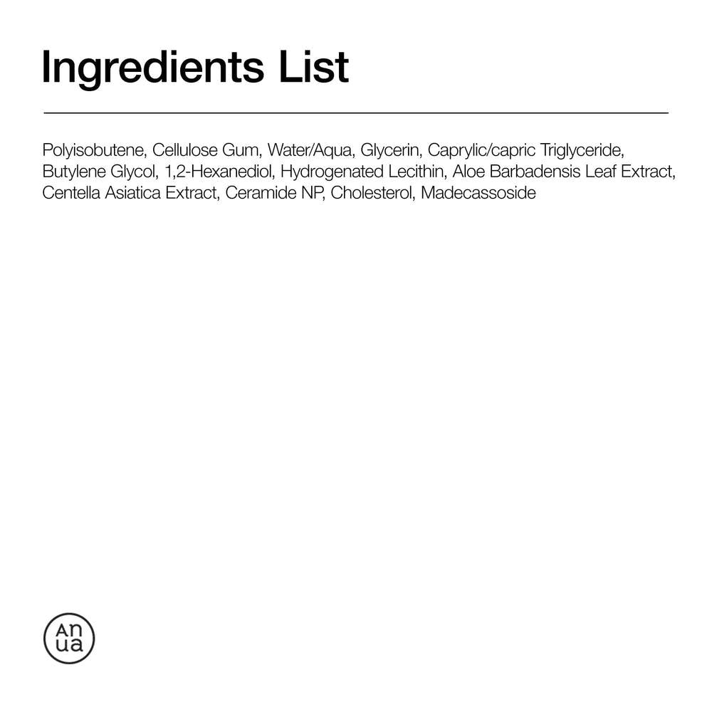 Polyisobutene, Cellulose Gum, Water/Aqua, Glycerin, Caprylic/capric Triglyceride, Butylene Glycol, 1,2-Hexanediol, Hydrogenated Lecithin, Aloe Barbadensis Leaf Extract, Centella Asiatica Extract, Ceramide NP, Cholesterol, Madecassoside
