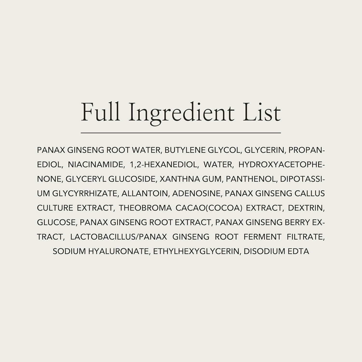 Panax Ginseng Root Water, Butylene Glycol, Glycerin, Propanediol, Niacinamide, 1,2-Hexanediol, Water, Hydroxyacetophenone, Glyceryl Glucoside, Panthenol, Xanthan Gum, Allantoin, Dipotassium Glycyrrhizate, Adenosine, Dextrin, Theobroma Cacao (Cocoa) Extract, Disodium Edta, Glucose, Panax Ginseng Callus Culture Extract, Panax Ginseng Root Extract, Panax Ginseng Berry Extract, Ethylhexylglycerin, Lactobacillus/Panax Ginseng Root Ferment Filtrate, Sodium Hyaluronate